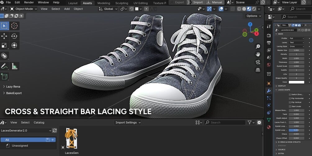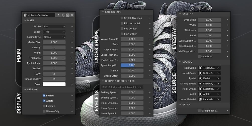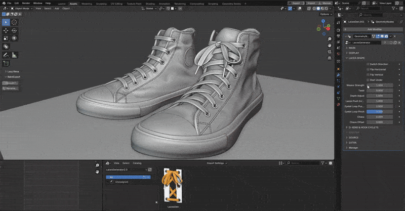 Create shoelaces or any laces in Blender with this goemetry nodes powered tool.